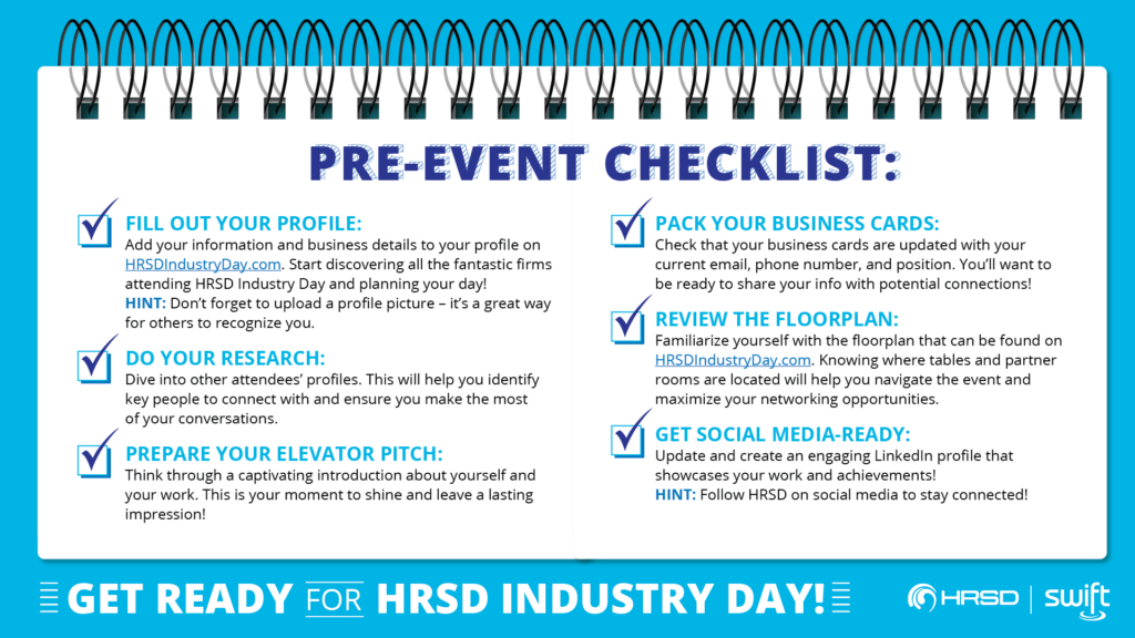 We are excited to welcome everyone back to the Holiday Inn Newport News – Hampton on January 29, 2026! To ensure you are fully prepared for an incredible day, look at the pre-event checklist. Let’s make HRSD Industry Day a success together!